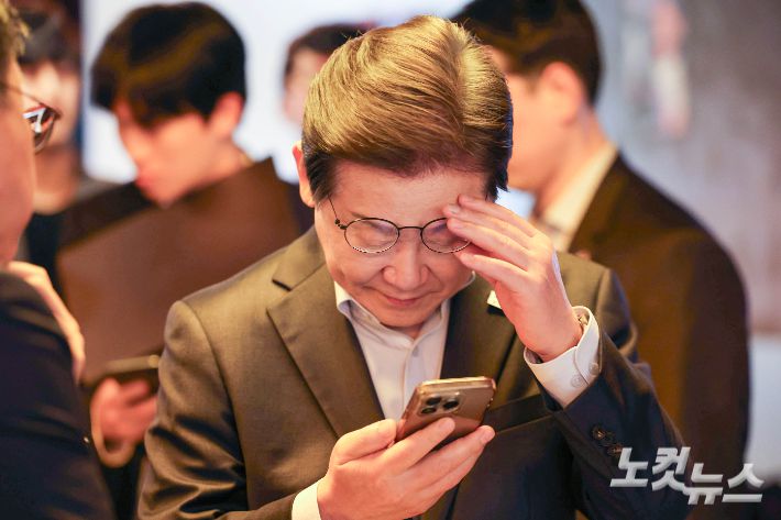 더불어민주당 이재명 대통령 후보가 노동절인 1일 오후 서울 종로구 삼일대로 한 식당에서 열린 민생시리즈2 <비전형 노동자 간담회>를 마치고 스마트폰을 보고 있다. 이 후보는 자신의 공직선거법 위반 사건을 대법원이 유죄 취지로 파기환송한 데 대해 "정치는 결국 국민이 하는 것"이라고 말했다. 황진환 기자