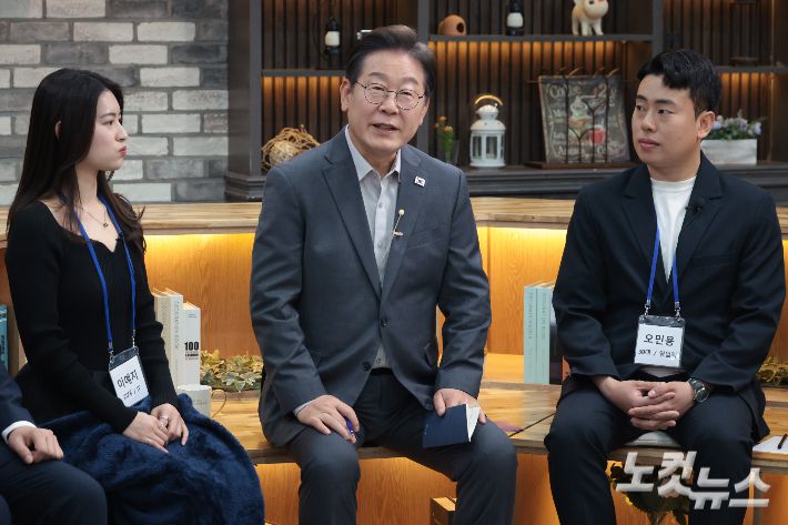 더불어민주당 이재명 대선 후보가 30일 오후 서울 구로구의 한 스튜디오에서 열린 '슬기로운 퇴근생활' 직장인 간담회에서 참가자들과 직장인의 고충에 대해 이야기를 나누고 있다. 국회사진취재단