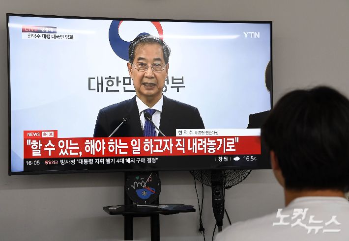 1일 오후 한덕수 대통령 권한대행의 사퇴 대국민담화가 TV생중계 되고 있다. 황진환 기자