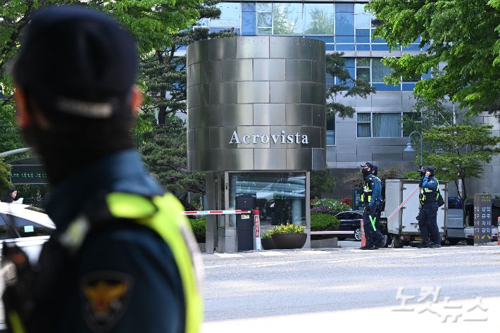 윤석열 전 대통령 부부와 일명 건진법사 전성배 씨 사이에서 일고 있는 각종 의혹을 수사 중인 검찰이 윤 전 대통령 사저 압수수색에 나선 30일 서울 서초구 아크로비스타에 경찰들이 근무를 서고 있다. 류영주 기자