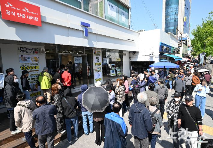 가입자 유심(USIM) 정보를 탈취당한 SK텔레콤이 유심 무료교체 서비스를 시작한 가운데 28일 오전 서울 시내 한 SKT 대리점에서 유심 교체를 하기 위한 이용자들이 줄을 서 기다리고 있다. SK텔레콤이 확보한 유심은 현재 100만 개 정도로, 가입자 2천300만 명에 비하면 턱없이 부족한 수준이다. 류영주 기자