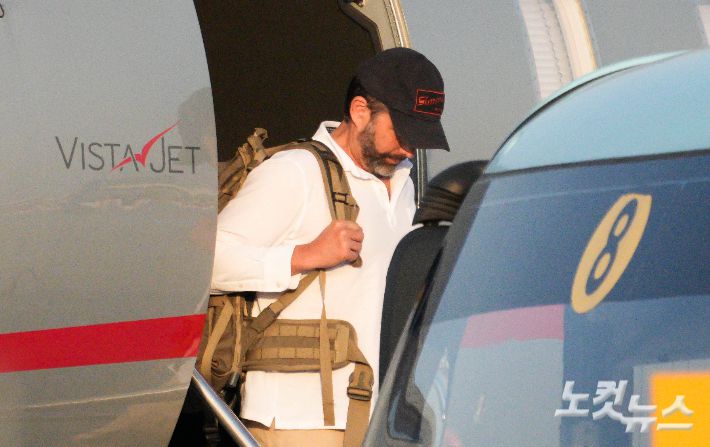 도널드 트럼프 미국 대통령의 장남 트럼프 주니어가 29일 오후 서울 강서구 서울김포비즈니스항공센터를 통해 입국하고 있다. 황진환 기자