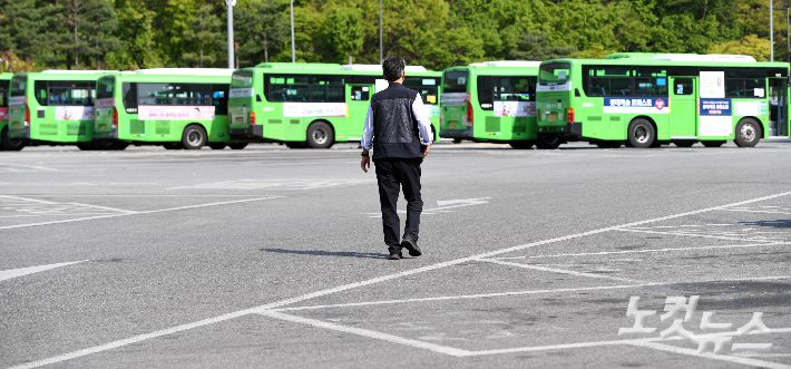 서울 시내버스 노사협상이 결렬되면서 노조가 준법 운행, 이른바 '준법투쟁'에 돌입한 30일 오전 서울 양천공영차고지에 운행을 앞둔 버스가 줄지어 주차돼 있다. 파업이라는 최악의 상황은 피했지만, 준법 운행은 안전 규정을 준수하며 버스를 운행해 운행 간격이나 속도 등을 조절하는 방법으로 연착을 유도하는 방식이다. 황진환 기자