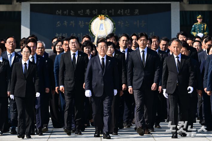 더불어민주당 이재명 대선후보가 28일 오전 서울 동작구 국립서울현충원에서 현충탑 참배를 마친 후 대통령 묘소로 향하고 있다. 윤창원 기자