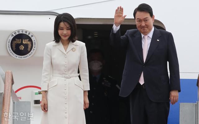 당시 윤석열 대통령과 김건희 여사가 2022년 6월 27일 취임 후 첫 해외 순방 일정으로 스페인 마드리드에서 열리는 북대서양조약기구(NATO) 정상회의 참석차 경기 성남 서울공항을 출발하며 손을 흔들고 있다. 성남=서재훈 기자 |