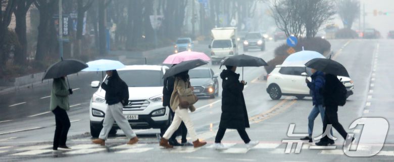 전북자치도 전주시 백제대로에서 우산을 쓴 시민들이 발걸음을 재촉하고 있다. 2025.2.12/뉴스1 ⓒ News1 유경석 기자 |
