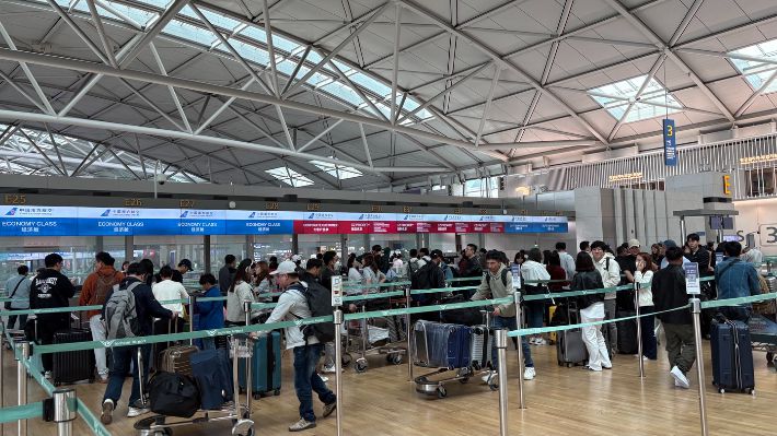 토요일인 3일 본격적인 연휴가 시작된 가운데 인천공항은 전날부터 이처럼 들뜬 여행객들로 북적였다. 다 함께 여행을 가는 대가족부터, 부부끼리 오붓하게 공항을 찾은 사람들까지 다양한 단위의 여행객들이 보였다. 곳곳에는 패키지여행 깃발을 든 단체들도 눈에 띄었다.
