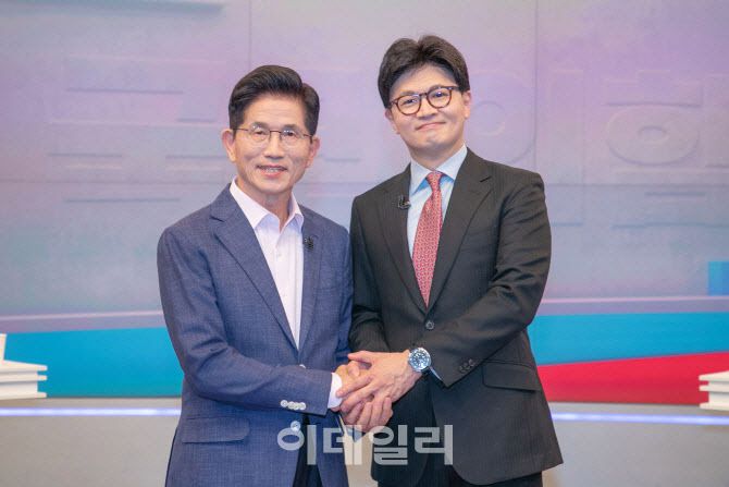 국민의힘 제21대 대통령선거 경선 결선투표에 진출한 김문수(왼쪽), 한동훈 후보가 30일 서울 중구 TV조선에서 TV토론에 앞서 포즈를 취하고 있다. (사진=연합뉴스) |