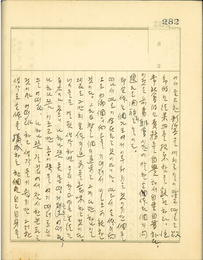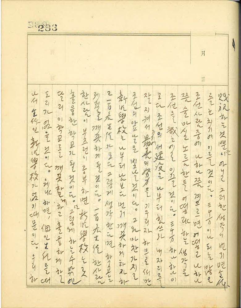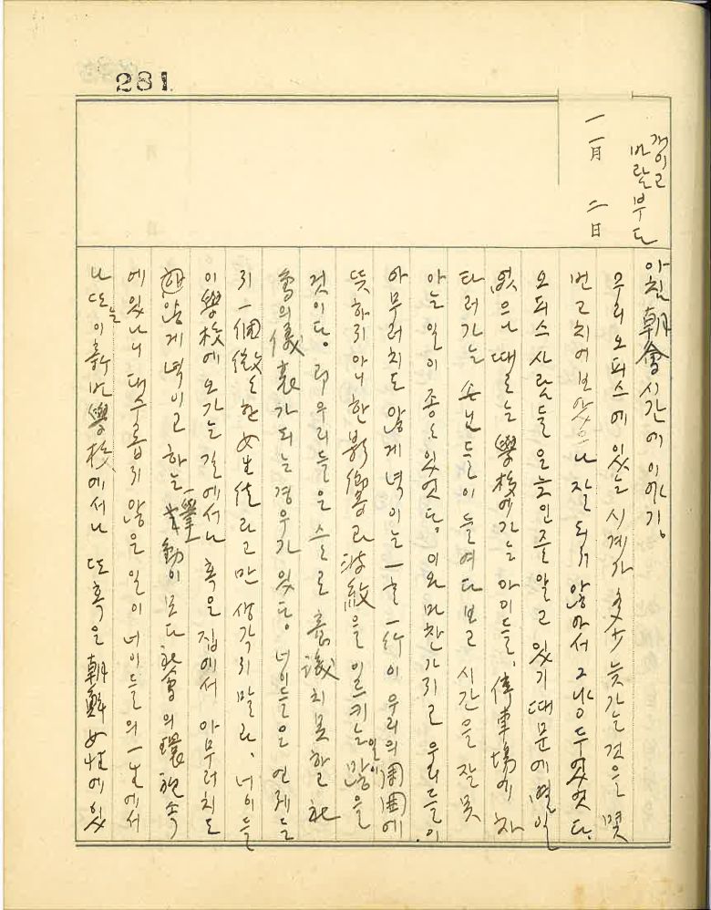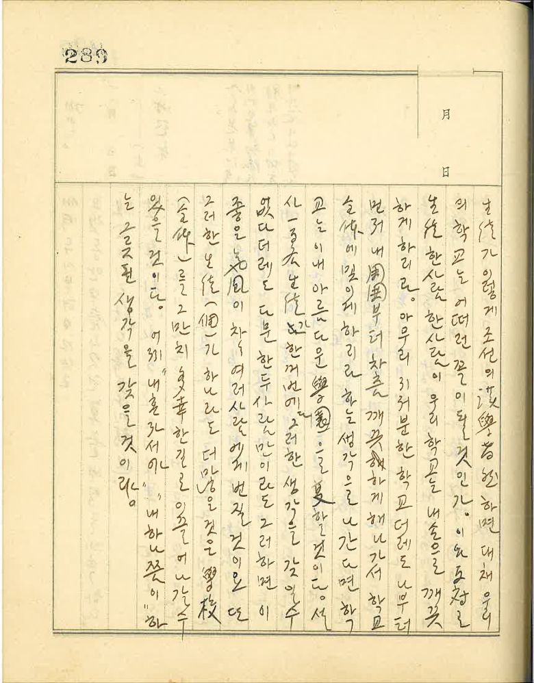 즉 우리들은 스스로 의식지 못하고 사회의 의표(儀表)가 되는 경우가 있다. 너희들은 언제든지 일개 미미한 여생도라고만 생각지 말라. 너희들이 학교에 오가는 길에서나 혹은 집에서 아무렇지도 않게 여기고 하는 거동이 모두 사회의 환시(環視) 속에 있나니 대수롭지 않은 일이 너희들의 일생에서나 또는 이 신명학교에서나 또 혹은 조선 여성에 있어서 지대한 영향을 끼치는 일이 많고 때로는 치명적인 결과를 초래함을 명기하라. 항상 사회적인 책무를 자각해서 자중자애하라. 이것은 전번 조회시간에 말한 전체(全體)와 개(個)의 문제와도 관련되는 일이다.