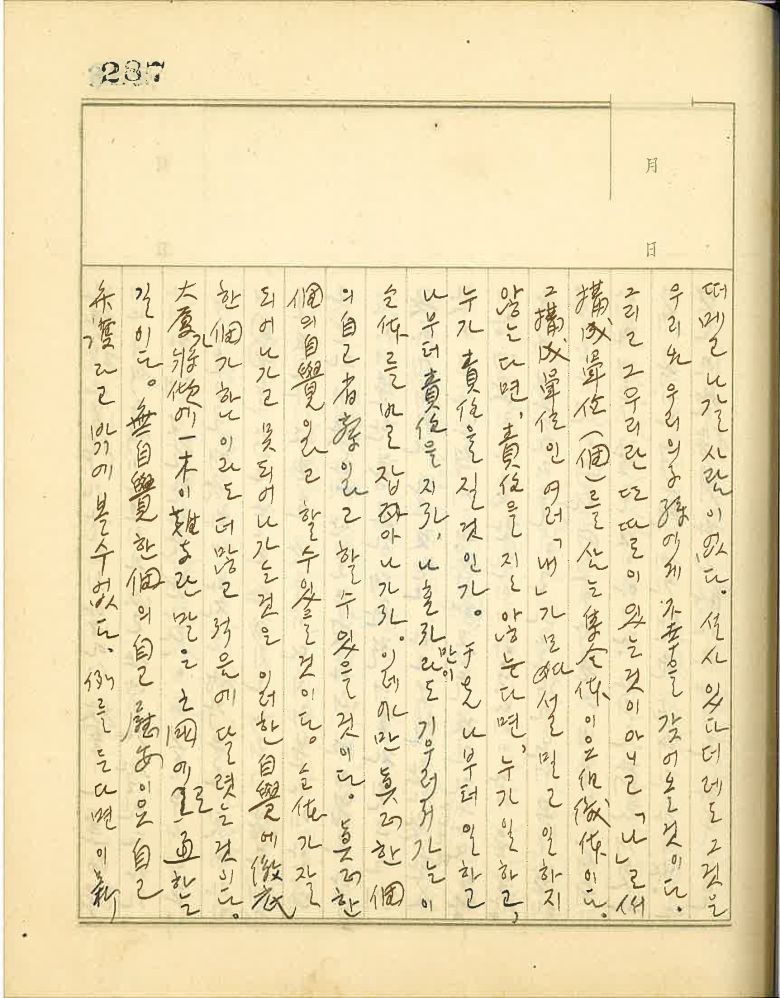 다른 사람들이 모두 주저앉아 버린다고 나도 주저앉는다면 전체는 다시 헤어날 길이 없다. 나 혼자만이라도 주저앉지 않고 꿋꿋하게 걸어 나가고 또 다른 사람들을 부추겨 일으켜서 이끌어 나가야만 전체에 광명이 있을 것이다. 한 사람이라도 이런 기개를 지닌 사람을 더 많이 가진 전체는 다행할 것이요, 또 그와 반대로 한 사람이라도 남이 다 주저앉으니 나도 주저앉아 버리겠다든가 또는 이 많은 사람 중에 나 하나쯤 주저앉은들 어떠랴 하는 사람이 더 많은 전체는 불행할 것이다. 전체와 개는 이렇듯 절대적인 관련을 가진 것이다. 전체를 떠난 개가 없고 개를 떠난 전체가 없다. 일본이 패배한 후의 일본사람의 비참한 현실을 보라. 그래도 전체를 떠난 개인이 있을 것이냐. 그래도 조선과 조선민족이야 이찌 되든 나 하나만 잘 살면 그만이라는 생각을 가질 수 있을 것인가.