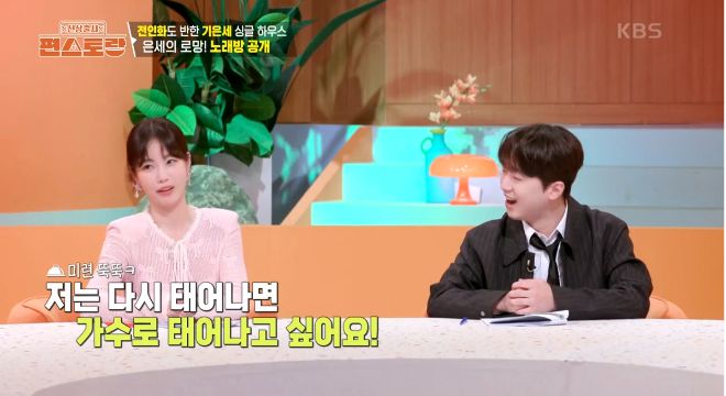 기은세는 “노래는 잘하진 않아요. 그냥 좋아할 뿐이에요”라며 겸손하게 웃었고, “다시 태어난다면 가수로 태어나고 싶다”고 말하며 노래에 대한 순수한 진심을 전했다.