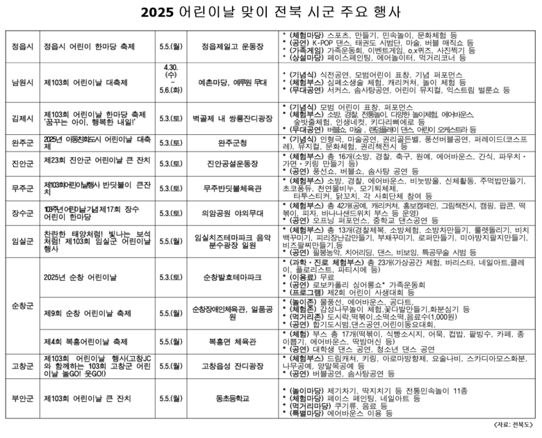 각 시·군도 다양한 프로그램을 선보인다. 전주시는 노송광장에서 아동 인권 캠페인과 놀이마당을 펼치며, 전주동물원은 어린이 무료입장과 조기 개장, 드림랜드 연계 운영 등 혜택을 제공한다. 군산시는 월명실내체육관과 군산대 대운동장에서 난타 공연, 가족 참여 프로그램 등으로 구성된 체험 행사를 열어 즐거움을 더한다.