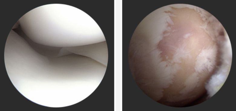 건강한 관절(왼쪽)과 퇴행성 관절염 환자의 관절 |