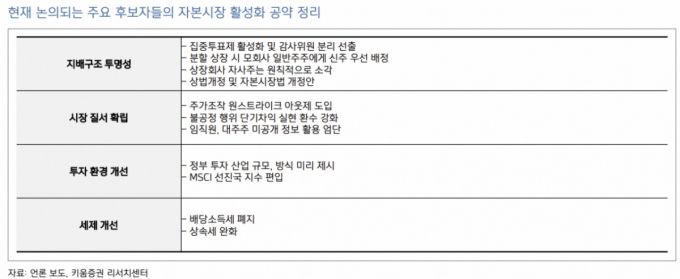 김용구 유안타증권 연구원은 "각 진영, 유력 후보자별 경제·금융 정책 방향성엔 차이가 존재하나 민간·기업 주도 경제 성장, 코리아 디스카운트 해소와 자본시장 활성화, 기업 지배구조 개선과 주주 친화적 재무정책 변화, AI(인공지능)·반도체·바이오 등 신성장 동력 집중 육성 등과 관련해선 별다른 이견이 없는 상황"이라고 말했다.