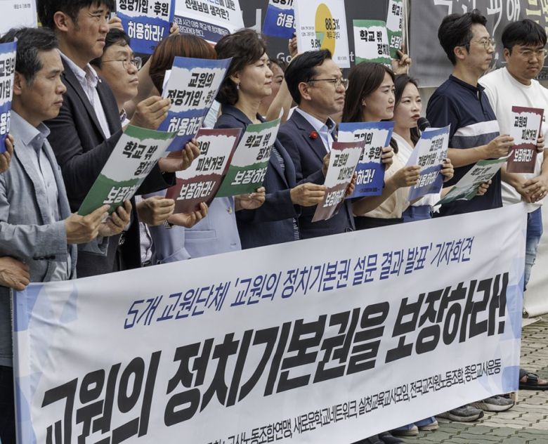 교원단체 회원들이 지난 2024년 7월 서울 영등포구 국회 앞에서 교원 정치기본권 보장을 촉구하는 기자회견을 하고 있다. 연합뉴스