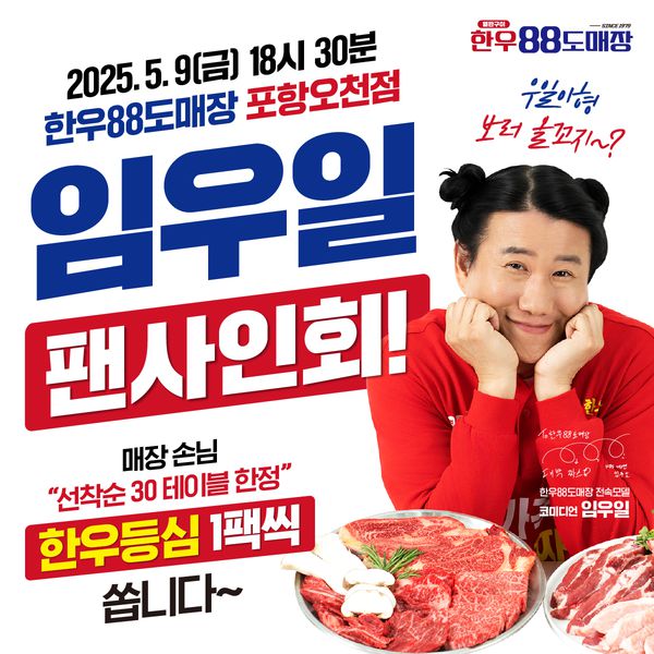 [스타데일리뉴스=황규준 기자] ㈜프로스이앤에프의 1등급 한우·한돈 가성비 소고기집 '한우88도매장' 포항오천점이 오픈을 기념하여 전속 모델 임우일과 함께하는 팬사인회를 진행한다고 3일 밝혔다.