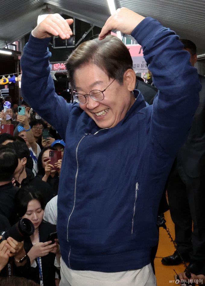 [고성=뉴시스] 조성우 기자 = 민심을 청취하는 '경청 투어'에 나선 이재명 더불어민주당 대선후보가 2일 오후 강원도 고성군 거진전통시장에서 상인들과 주민들에게 하트를 만들어 보이고 있다. 2025.05.02. xconfind@newsis.com /사진=조성우 |