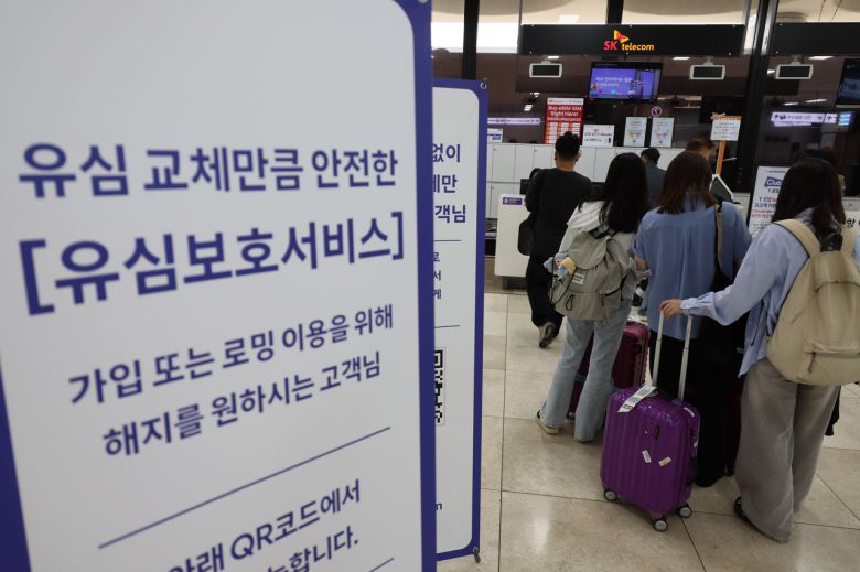 2일 서울 강서구 김포공항 국제선 청사 내 SK텔레콤 부스에서 여행객들이 유심 교체를 위해 대기하고 있다. [연합] |