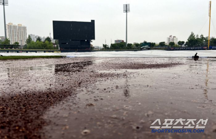 경기 시작 2시간 전인 오후 12시에도 비가 그치지 않았고, 비가 그친다고 해도 이미 내린 강수량이 상당해 그라운드 정비에 많은 시간이 소요될 것으로 예상됐다. 초대형 방수포 위에는 흥건하게 물 웅덩이가 크게 생겨있는 상태였다.