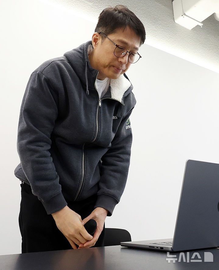 [성남=뉴시스] 추상철 기자 = 김석환 위믹스 재단 대표가 3일 오전 경기 성남시 판교 테크원타워에서 열린 '국내 가상자산 거래소의 위믹스 상장폐지 결정'과 관련 긴급 기자간담회에서 고개숙여 사과하고 있다. 2025.05.03. scchoo@newsis.com