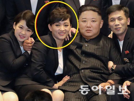 2021년 7월 11일, 김정은과 북한 예술인들이 함께 찍은 사진. 원 안의 여성이 가수 김옥주다. 그는 김정은의 어깨와 허리에 손을 얹어 친밀감을 과시했다. 동아일보 DB |