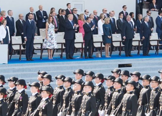 2017년 프랑스 방문 당시 에마뉘엘 마크롱 프랑스 대통령과 바스티유 군사 퍼레이드를 지켜보는 도널드 트럼프 미국 대통령. 사진 AP=연합뉴스 |