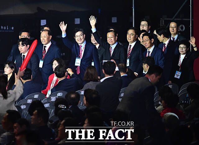 국민의힘은 3일 "이번 대통령 선거는 자유냐 독재냐를 선택하는 선거"라며 "이 나라 주인은 이재명이 아니라 국민이라는 사실을 당당히 선언하고 이재명과 더불어민주당의 폭주를 심판해달라"고 호소했다. 사진은 당원들에게 인사하며 입장하는 국민의힘 지도부. /배정한 기자 |