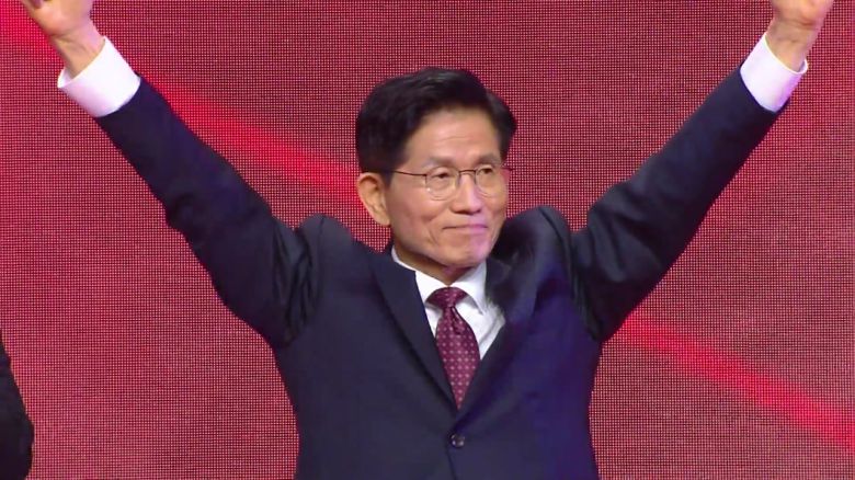 먼저 김문수 후보. 선거인단 결과 24만 6519표. 여론조사 결과 51.81%. 환산 득표수 20만 8525표. 최종 합산 45만 5044표. 득표율 56.53%입니다. 다음으로 한동훈 후보. 선거인단 결과 15만 5961. 여론조사 결과 48.19%. 환산 득표수 19만 3955. 최종 합산 결과 34만 9916표. 득표율 43.47%입니다. 그러면 개표 결과에 따른 국민의힘 제21대 대통령 후보자를 발표하겠습니다. 국민의힘 제21대 대통령 후보자로 최고 득표를 기록한 김문수 후보가 선출되었음을 선포합니다.