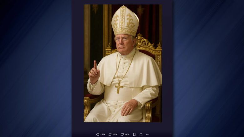 인공지능으로 만든 것으로 보이는 사진에서 트럼프 대통령은 교황이 입는 흰색 예복에 금색 십자가 목걸이를 걸고, 오른쪽 집게손가락은 하늘로 향해 들었습니다.