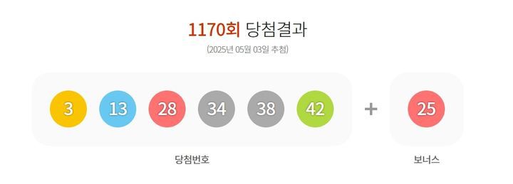 [서울=뉴시스] 3일 제 1170회 동행복권 로또 추첨 결과 '3, 13, 28, 34, 38, 42'이 1등 당첨 번호로 결정됐다. 2등 보너스 번호는 '25'다. (사진=동행복권 홈페이지 캡처) 2025.05.03 photo@newsis.com *재판매 및 DB 금지
