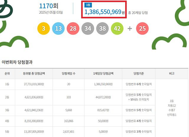 1170회 1등 당첨번호 '3, 13, 28, 34, 38, 42'···보너스 번호 '25'