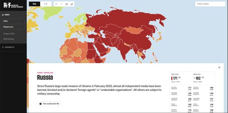 국경없는기자회(RSF)는 세계 언론자유의 날을 맞아 전 세계 국가의 언론 자유도 지수를 공개했다. 러시아의 언론 자유도 순위는 171위를 기록했으며 162위였던 2024년 대비 9위 하락했다. 사진=RSF홈페이지캡처 |