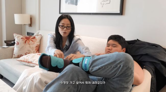 오윤아는 "수영장 가고 싶어서 뛰어 내려오다가, 핸드폰 보다 다쳤다"라며 "아무도 못 봤다, 넘어진걸. 내려오다가 발을 접질렸나 보다. 아침에 나와서 비몽사몽이어서 왔다. 얘는 차에 타 있었는데, 다리가 너무 아프다는 거다. 만지지도 못하게 해서 봤더니 엄청나게 부었더라"라고 설명해 안타까움을 더했다.