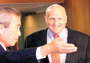 미사일 방어망 등을 협의하기 위해 한일 순방에 나선 리처드 아미티지 미 국무부 부장관이 2001년 5월 8일 일본 외무성 관계자의 영접을 받고 있다./AFP연합뉴스