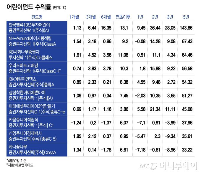 4일 금융정보업체 에프앤가이드에 따르면 지난 4월30일 기준 5년 수익률이 가장 높은 어린이 펀드는 '한국밸류10년투자어린이증권투자신탁 1(주식)(A)'로, 수익률 143.86%를 기록했다. 3년 수익률은 36.44%다.