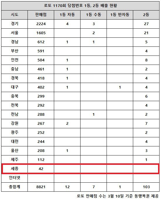 동행복권이 3일 추첨한 로또 1170회 당첨번호 조회 결과 1등은 20명, 2등은 103게임이다. 전국 17개 시도 중 세종 지역에서는 로또 고액(1,2등) 당첨 판매점이 단 한 곳도 나오지 않았다.