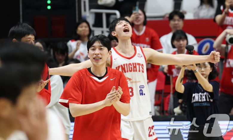 29일 오후 경기 수원시 권선구 수원KT소닉붐아레나에서 열린 '2024-2025 KCC 프로농구' 4강 플레이오프 4차전, 수원 KT와 서울 SK의 경기에서 승리를 거둔 SK 선수들이 기뻐하고 있다. 이날 경기는 서울 SK가 69대57으로 승리했다. 2025.4.29/뉴스1 ⓒ News1 김영운 기자 |