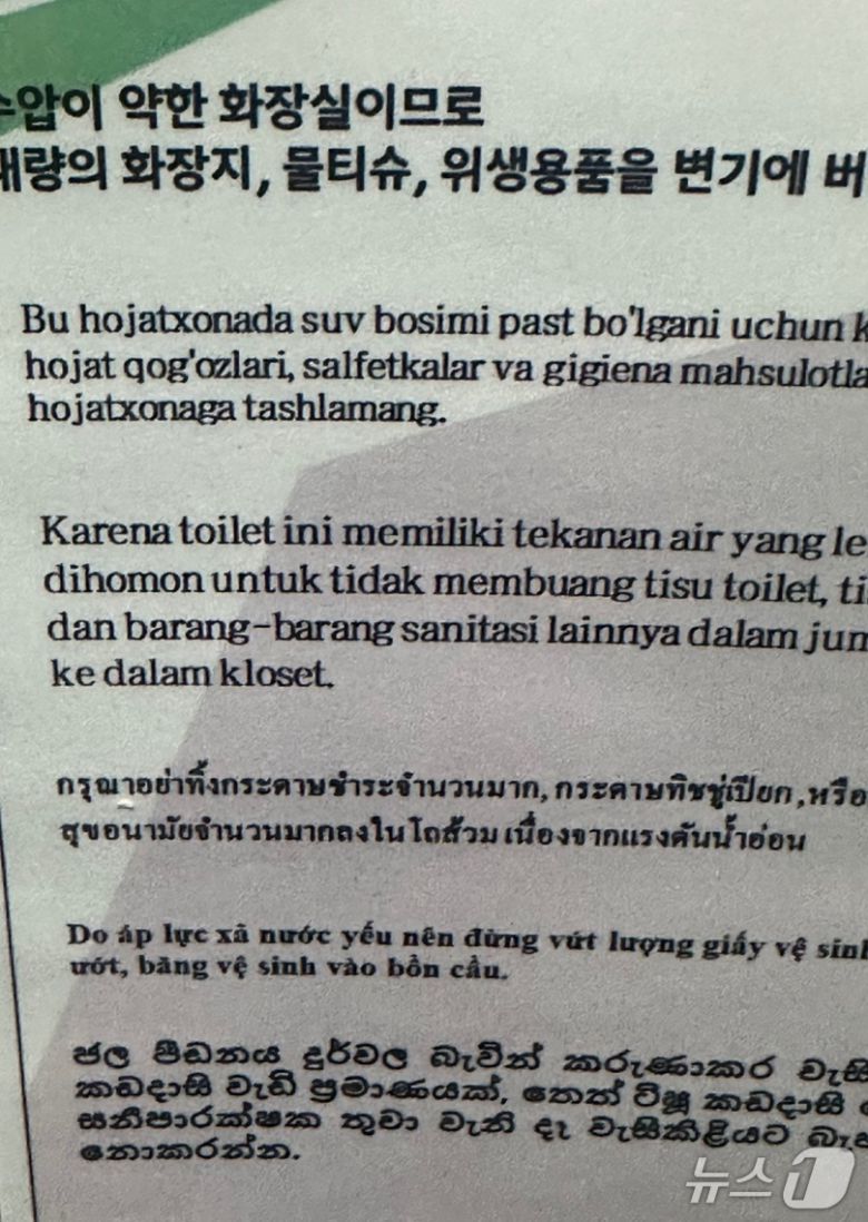 (울산=뉴스1) 김지혜 기자어느 화장실이든 벽면에서 쉽게 찾아볼 수 있는 안내문구다. 수도 없이 많은 안내 문구를 봐왔지만, HD현대중공업 내 화장실에는 무려 5개 국어로 번역된 안내문이 붙어있다.