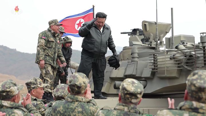 [서울=뉴시스] 김진아 기자 = 김정은 북한 국무위원장이 지난 13일 탱크병 대연합 부대 간의 대항 훈련 경기를 지도했다고 조선중앙TV가 14일 보도했다. 김 위원장은 훈련을 현지지도하고 신형 탱크를 몰아보이기도 했다. (사진=조선중앙TV 캡처) 2024.03.14. photo@newsis.com  *재판매 및 DB 금지