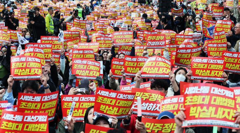 3일 오후 서울 서초구 대법원 앞에서 열린 촛불행동 주최 제138차 촛불대행진에서 참가자들이 대법원의 이재명 더불어민주당 대선 후보에 대한 공직선거법 위반 사건 판결을 규탄하는 구호를 외치고 있다. 2025.5.3 뉴스1 |