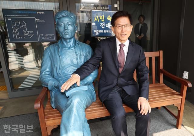 국민의힘 대선 후보로 확정된 김문수 전 고용노동부 장관이 4월 10일 서울 종로구 전태일기념관에 설치된 전태일 동상 옆에 앉아 있다. 박시몬 기자