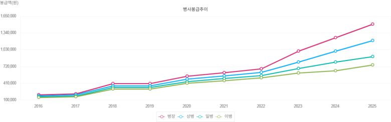 군 장병의 급여가 증가세라는 점도 한 몫한다. 병역의무를 이행하는 병사에게 매월 지급하는 급여는 이병이 2016년 14만8000원에서 올해 75만 원으로 약 9년 새 5.1배 증가했다. 같은 기간 병장 급여는 19만7000원에서 150만 원으로 약 7.6배 늘었다.
