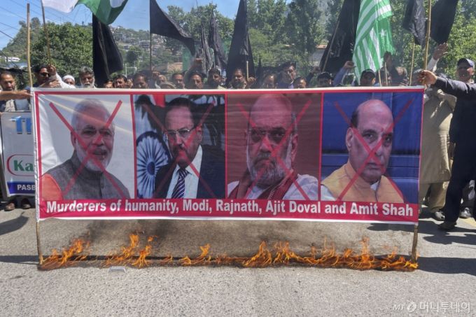 [무자파라바드=AP/뉴시스] 25일(현지 시간) 파키스탄령 카슈미르 무자파라바드에서 인도 정부의 수자원 공유 중단을 규탄하는 시위에 나선 카슈미르 난민 단체 회원들이 나렌드라 모디 인도 총리 등의 사진이 담긴 현수막을 불태우며 구호를 외치고 있다. 앞서 인도 정부는 카슈미르 총격 테러에 따른 조치로 국경 폐쇄, 물 공유 중단, 자국 내 파키스탄인에 대한 출국 조치 등 파키스탄에 대한 외교적 대응을 결정한 바 있다. 2025.04.25. /사진=민경찬 |