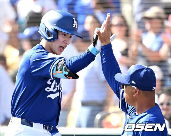 [OSEN=글렌데일(미국), 이대선 기자] '코리안 데이'였다.이정후(샌프란시스코 자이언츠)와 김혜성(LA 다저스)이 맞대결에서 나란히 맹활약했다. LA 다저스와 샌프란시스코 자이언츠는 2일(이하 한국시간) 미국 애리조나주 글렌데일의 캐멀백 랜치에서 2025 메이저리그 시범경기를 치렀다.이날 김혜성은 8번 유격수로,이정후는 3번 중견수로 각각 선발 출장했다. 이정후가 총알 2루타로 선제 타점을 올리자, 7푼 타율로 마음고생을 하던 김혜성은 시범경기 첫 홈런포를 터뜨렸다.5회초 무사에서 LA 다저스 김혜성이 좌월 솔로 홈런을 치고 더그아웃에서 데이브 로버츠 감독과 하이파이브를 하고 있다. 2025.03.02 / sunday@osen.co.kr |
