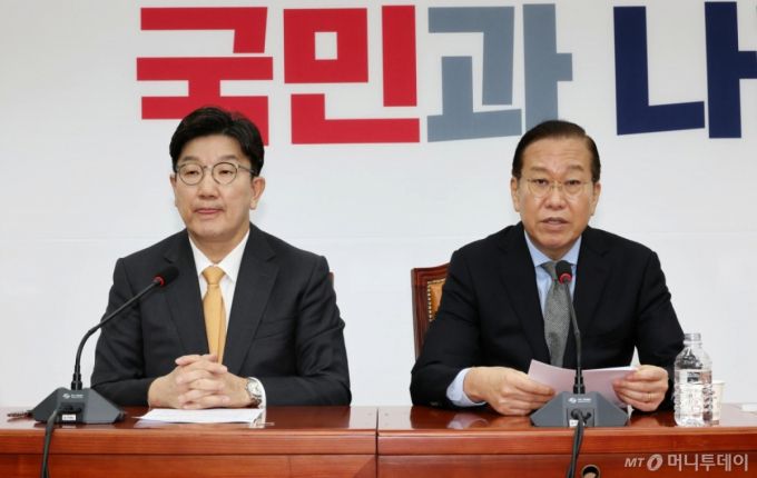 권영세(오른쪽) 국민의힘 비상대책위원장이 지난 3월 24일 서울 여의도 국회에서 열린 한덕수 국무총리 탄핵 기각 관련 기자회견에서 발언하고 있다. 왼쪽은 권성동 원내대표. /사진=뉴시스 |