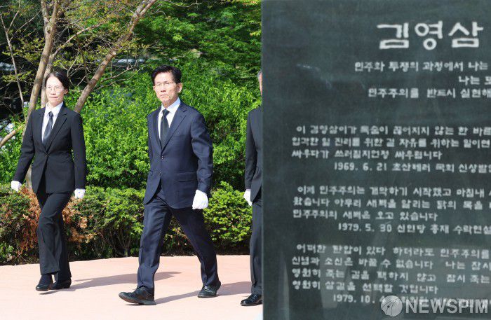 [서울=뉴스핌] 이호형 기자 = 김문수 국민의힘 대선 후보가 4일 오전 서울 동작구 국립서울현충원에서 김영삼 전 대통령 묘역을 참배하기 위해 방문하고 있다.   2025.05.04 leemario@newspim.com