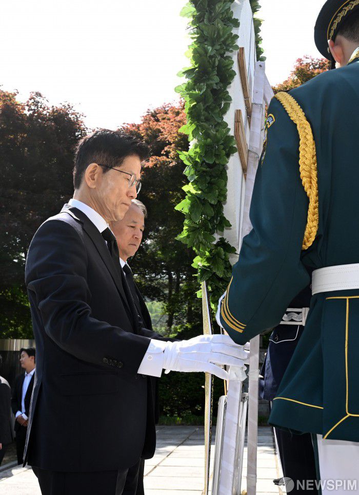 [서울=뉴스핌] 이호형 기자 = 김문수 국민의힘 대통령선거 후보가 4일 오전 서울 동작구 국립서울현충원 이승만 전 대통령 묘역을 찾아 헌화하고 있다. 2025.05.04 leemario@newspim.com