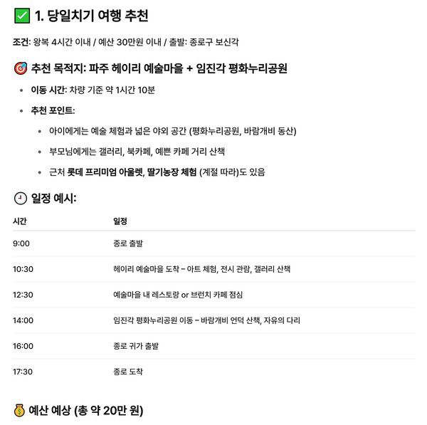 챗GPT는 파주 헤이리 예술마을과 임진각 평화누리공원을 추천했다. 예술 체험과 자연을 결합해 아이와 부모 모두가 만족할 수 있는 코스로 구성했다. 예산은 20만원 안팎이다. 갤러리 산책과 바람개비 동산, 주변 아울렛 등 콘텐츠의 균형이 돋보인다. 실용성과 감성 사이의 절충점이 강점이다. 다만 구체성은 떨어져 예산 초과 가능성이 있다. 어린이날이라는 특성보다 가족 나들이에 방점이 찍혔다.