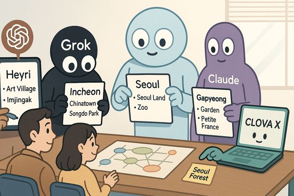 비교 대상은 오픈AI의 챗GPT xAI의 그록3 구글 제미나이 어드밴스드 2.0 플래시 앤트로픽의 클로드 3.7 소넷 네이버의 클로바 X까지 총 5종 무료 버전이다. 가입 후 첫 질문에 주요 AI 모델들은 각기 다른 방식으로 연휴 계획을 설계했다. 모델마다 추천 코스의 성격과 표현 방식, 여행지 선호 경향에 크고 작은 차이를 보였다.