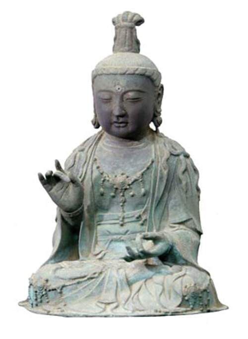 ‘금동관세음보살좌상’의 운명은 그야말로 기구하다. 1951년 일본 간논지(관음사) 주지가 발견한 복장 유물에서 ‘천력삼년, 고려국 서주 부석사 당주 관음결연문’이라는 기록이 나왔다. 풀어보면, 1330년 고려시대 충남 서산(옛 이름 서주) 부석사에 모셔졌다는 것이다. 높이 50.5㎝, 무게 38.62㎏인데, 일본은 1973년 무형문화재로 지정했다. 학계는 1352~1381년께 충남 서산 일대에 침략한 왜구가 약탈해 일본으로 가져간 것으로 추정한다.